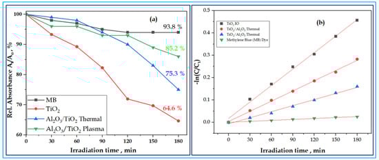 The results of the photocatalytic activity of the samples are shown in Figure 7 and Figure 8. These figures further show the decolorization of MB dye in the solution of TiO2 IO and Al2O3/TiO2 thermal and plasma ALD under UV and visible light irradiation as a function of time (Figureand the decolorization of the MB in the solution, pseudo-defined by Equation (2),