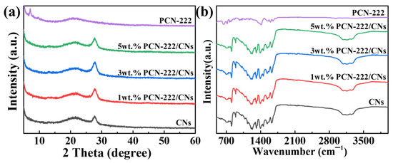 (a) XRD patterns and (b) FT-IR patterns of PCN-222, CNs and PCN-222/CNs.