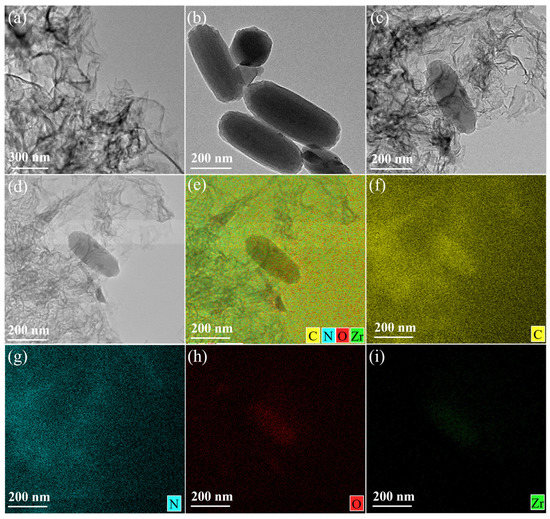 The morphological structure of PCN-222, 2D CNs and PCN-222/CNs were characterized by TEM (Figure 2). According to Figure 2a, it is clear that 2D CNs display almost transparent flake morphologies, demonstrating their atomically thin thickness. PCN-222 is a relatively uniform rod-like structure with a length of about 300–500 nm (Figure 2b). Upon constructing the van der Waals heterojunction, PCN-222 was wrapped in 2D CNs (Figure 2c), indicating an effective interfacial contact between 2D CNs and PCN-222 to enhance the photocatalytic performance [36]. Furthermore, the presence of carbon, nitrogen, oxygen and zirconium in PCN-222/CNs from the EDS images clearly demonstrates the successful construction of the van der Waals heterojunction (Figure 2d–i). The results of TEM further prove the successful construction of van der Waals, which is consistent with the above XRD and FT-IR results.