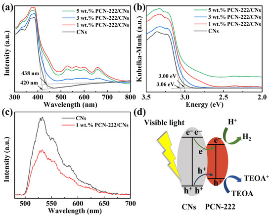 The optical absorption property of CNs and PCN-222/CNs were analyzed by UV–Vis, and the results can be observed in Figure 4. It can be seen that the sample of CNs in Figure 4a displays an absorption edge at 420 nm, which is the result of electrons shifting from N 2p to C 2p orbitals [36]. Then, it is calculated that the band gap is 3.06 eV, which is in agreement with previous studies (Figure 4b) [15,30]. When PCN-222 was introduced to construct the vdWHs, it was observed that the absorption edge of the sample was improved. When the content of PCN-222 was 1%, the maximum absorption edge of the sample increased to 438 nm. However, the absorption edge decreased when adding 3% or 5% PCN-222. This is because if excessive amounts of PCN-222 is introduced, PCN-222 may aggregate and cover the surface of CNs, and then compete with CNs to absorb visible light [39]. In addition, the corresponding band gap of 1 wt.% PCN-222/CNs is calculated to 3.00 eV. According to the results of UV–Vis, we can conclude that the introduction of PCN-222 can narrow the band gap and enhance the absorption of visible light photons, which will benefit the photocatalytic reaction. Furthermore, to further explore the mechanism of the enhanced photocatalytic activity of the PCN-222/CNs vdWHs, PL tests were performed as depicted in Figure 4c. It can be observed that the emission peaks of PCN-222/CNs vdWHs and CNs have the same position, but the intensity is obviously different. Compared with the CNs, the strength of PCN-222/CNs vdWHs shows lower intensity, indicating that the addition of PCN-222 can improve the separation efficiency of electron-hole pairs [33,40]. The photocatalytic hydrogen evolution mechanism of the PCN-222/CNs vdWHs is proposed, as represented in Figure 4d. Under the irradiation of visible light, photogenerated electron-hole pairs can be generated both in CNs and PCN-222. Then, photogenerated electrons can be quickly transferred to the conduction band of PCN-222 through CNs and react with H2O to generate H2, while photoinduced holes are transferred and accumulated in the valence band of PCN-222 to oxidize TEOA to TEOA+ [39,40]. Therefore, the construction of PCN-222/CNs vdWHs can enhance the photocatalytic hydrogen evolution ability through the effective separation of charges.