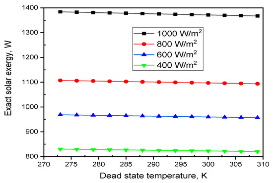 The sun is considered as a reservoir of energy. As stated by Takashima [36], the exergy flow rate in the global solar radiation E ˙ X , S u n is equal to the solar flux Q ˙ s u n , i n = A C I T = E ˙ X , S u n