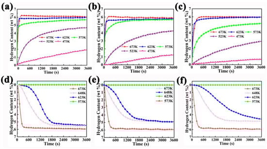 The kinetics curves of hydrogen absorption for MgH2-2.5 wt% ZnO (a); MgH2-5 wt% ZnO (b); MgH2-7.5 wt% ZnO (c); and the kinetics curves of hydrogen desorption for MgH2-2.5 wt% ZnO (d); MgH2-5 wt% ZnO (e); MgH2-7.5 wt% ZnO (f) at different temperatures.