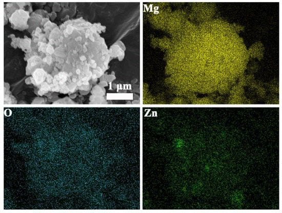 In order to further ensure the element composition of the different states of MgH2-ZnO, the element mapping of the composites with different states of ball milling, dehydrogenation, and re-hydrogenation. Figure 8 shows that the elements of Mg, Zn, and O are uniformly distributed, and Mg is the dominant element. The XRD pattern shown in Figure 3a also confirms that ZnO exists in the composite after ball milling, implying that the ZnO remains stable during ball milling. As for MgO, it is inevitable for the formation of MgO for the high activity of the powder after ball milling; therefore, the O element in Figure 8 is also contributed from MgO to some extent.