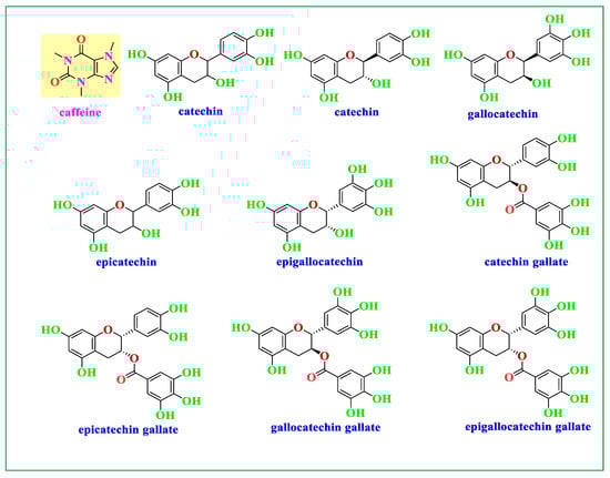 Green tea (GT) is a popular herbal drink that is consumed by people around the world. There are several significant ingredients in GT, and the most prevalent polyphenols (PPHLs) in GT are catechins, which are a class of flavonoid compounds and provide the antioxidant properties to the beverage. Epicatechin (EC), epicatechin-3-gallate (ECG), epigallocatechin (EGC), and epigallocatechin-3-gallate are the four primary catechins present in GT. Figure 1 displays the two most abundant components in GT, and the components of GT extract enriched by N, C=O, and OH functional groups, respectively. The amino acid theanine may help people feel peaceful and relaxed by having a calming impact on the brain. Other PPHLs found in green tea, including quercetin, kaempferol, and myricetin, have been associated with a number of health advantages []. Various methodologies have been applied in NP synthesis. The biosynthesizing of Ag NPs using plant metabolites as capping and reducing agents are often preferred. This is owing to the cost-effective, eco-friendly, and lower cytotoxicity effect on human cells [,,,,]. In this study, the biosynthesis of Ag NPs using GT aqueous extract as a reducing agent is aimed, followed by assessing the activity against clinical isolates of both Gram-negative and Gram-positive bacteria.