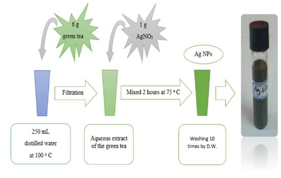 Aqueous extract of GT was used as a reducing agent to prepare Ag NPs. Figure 2 portrays the schematic fabrication of the Ag NPs. The procedure comprised weighing 6 g of GT powdered leaves and subsequently adding them to a 250 mL water bath (80 to 100 °C). The GT aqueous extract was used for the synthesis of Ag NPs. Afterwards, 1 g of silver nitrate (AgNO3) (>99.9%) was added into the GT extract, and the color of the mixture was changed from light to dark green. The mixture was then heated for two hours at 75 °C on a hotplate, followed by centrifuging the samples at 4600 rpm for 30 min. The Ag NPs were thoroughly washed ten times using sterile distilled water and the solution was kept at RT for later usage.