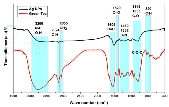 Investigation of Ag NPs and crude leaf extracts is helpful to confirm the appearance of several functional groups involved in the synthesis of Ag NPs. Figure 4 exhibits the FTIR spectra of the Ag NPs and the extract of GT together []. A large amount of organic chemicals are found in tea, for example, trace elements, minerals, volatile chemicals, proteins, glucides, amino acids, alkaloids, and the most intriguing substances, which are polyphenols (PPHLs) [,]. The core components of PPHLs were shown in Figure 1. There are also caffeine and theophylline along with PPHLs []. From Figure 4, it can be observed that all the peaks ascribed to GT also appeared in Ag NPs spectra, but with lower intensity and broader character. The adsorption and attachment of Ag NPs on functional groups of GT are responsible for lowering the intensity of the peaks and, consequently, broadening of peaks is expected.