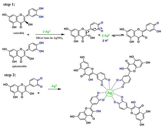 A silver ion reduction map based on GT leaf extract PPHLs is presented in Figure 5 in light of previous [,,] studies and the FTIR analysis of the current investigation. In a previous work, it was demonstrated using density functional theory (DFT) analysis that the catechol moiety of flavonoids in leaf extract solution is more stable than other flavonoid-OH groups []. Ag+ was able to form complexation with flavonoids and other PPHL groups, according to the hypothesized structure for the creation of the Ag complex (see Figure 5), so it is clear that electron transfer through oxidation from PPHLs to Ag+ is essential for the production of Ag NPs. The previous study found that the extract solutions of green leaves contained significant amounts of PPHL conjugates, PPHLs, carboxylic groups, hydroxyl groups, and conjugated double bonds []. It is worth mentioning that the oxidation of the PPHLs is accompanied by the reduction of Ag+ ions []. Specifically, the di-ortho-hydroxyl group in the B-ring facilitates the reduction process of the Ag+ ions to Ag NPs after releasing two electrons. It often occurs where Ag NPs are formed in the presence of flavonoids []. In addition to the strong chemistry relation between the electron-rich oxygen in the PPHLs and the silver orbital, the lone pair of electrons in PPHLs participate in the Ag NP dispersal and stabilization []. The Ag NP synthesis in the current report possesses similar FTIR spectra to those obtained by Kaur and Jaryal, [] who prepared Ag NPs using biogenic tea waste. In order to acquire additional confirmation, a UV-Vis investigation of Ag NPs was carried out; the results are provided in the previous section. It was illustrated that Ag NPs demonstrate SPR band in the visible spectrum.