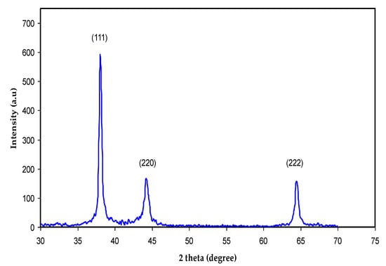 Crystalline and amorphous materials can be distinguished through XRD examination. Figure 6 shows the XRD pattern for biosynthesized Ag NPs at ambient temperature. In Figure 6, there are three sharp peaks at 2θ = 38°, 44°, and 64°, which correspond to silver crystals (111), (220), and (222), respectively. These results confirm that Ag NPs have a crystalline structure of FCC on the basis of the results published by other researchers [,]. The un-split (111) peak had the strongest peak intensity at 2θ = 38°, indicating that the (111) facet is the main Ag NP orientation, followed by the (220) and (222) facets [,]. According to the Debye-Scherrer equation, crystallite size (D) can be measured in nm.