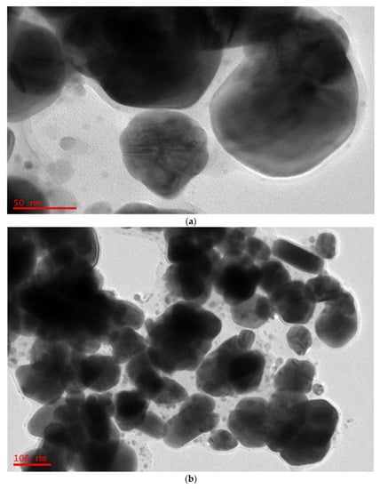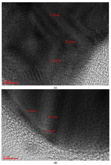 The XRD pattern and these results agree. They are connected to planes (111), (220), and (222), respectively, which make up a silver crystal’s FCC structure. The structure’s IPDs, however, are d = 2.40 nm, and they match plane (111) [,,]. Previous research demonstrated that the IP lengths of 0.25 nm and 0.24 nm correspond to the crystallographic Miller indices (100) and (101), respectively []. The micrographs (see Figure 7c,d) show that the crystal symmetries of Ag NPs have face-centered cubic (FCC) dominancy based on the IPDs [].