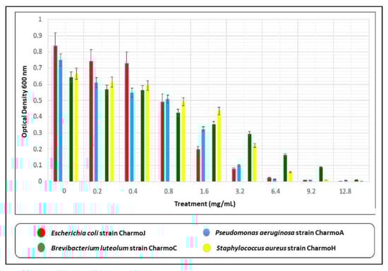 Different bacterial species have shown different responses in dealing with biosynthesized Ag NPs []. In this study, Ag NPs at concentrations ranging between 0.2 mg/mL and 12.8 mg/mL were used. Figure 9 exhibits the effect of different concentrations of biologically synthesized Ag NPs on the growth of tested bacterial strains.