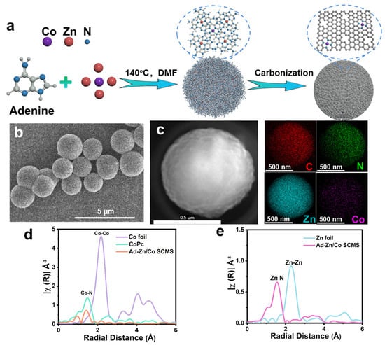(a) Schematic diagram for synthesizing Ad−Zn/Co SCMS and CoSA/N−PCMS. (b) SEM image of Ad−Zn/Co SCMS. (c) Elemental mapping images of Ad−Zn/Co SCMS. (d) Co K-edge and (e) Zn K-edge FT-EXAFS spectra of Ad−Zn/Co SCMS and reference samples.