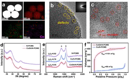 (a) Elemental mapping images of CoSA/N−PCMS. (b) HRTEM image of CoSA/N−PCMS (inset: corresponding SAED pattern). (c) ABF-STEM image of CoSA/N−PCMS. (d) XRD patterns and (e) Raman spectra of CoSA/N−PCMS and reference samples. (f) N2 adsorption-desorption isotherms of CoSA/N−PCMS and Co/N−PCMS.