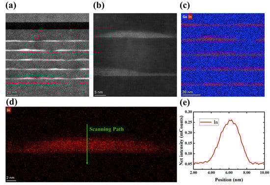 (a) Cross-sectional TEM image of InGaN/GaN MQDs in LED wafer; (b) enlarged local TEM image of InGaN QDs; (c,d) EDS mapping image of Ga and In element; (e) In element line scanning of the InGaN QD along the green arrow line.