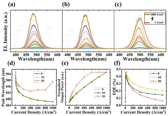 EL spectra of (a) 8 µm, (b) 10 µm and (c) 20 µm InGaN QD micro-LEDs array under injection current densities from 1 A/cm2 to 1000 A/cm2; the variation of (d) EL peak wavelength, (e) LOP, and (f) EQE with injection current.
