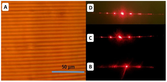 In contrast to the thermoplastic polymers, the elastomer VHB 4905 does not support the heat-shrinkage modality and for this reason it was anisotropically and mechanically pre-stretched in two orthogonal directions. As a result, the laser-inscribed bulk grating period could be then increased or decreased by the following external deformation. In Figure 7 below, the inscribed bulk diffraction grating, possessing the 10 μm period and the sinusoidal profile is shown along with its 633 nm diffraction pattern and the 633 nm diffraction patterns of the mechanically relaxed pre-stretched material. Surprisingly, the two-fold shrinkage of the bulk diffraction grating resulted only in the 7.5-μm period, while the four-fold shrinkage yielded in the 4.5-μm period, according to the visual resizing of the modified region, which is apparently lower than that of the original non-modified material around it.