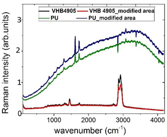 Raman spectra acquired in the non-modified and modified (inscribed diffraction grating) regions inside VHB 4905 elastomer and PU thermoplastic polymer at the 532 nm laser excitation.