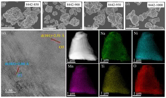 Morphology of (a) 8442-850, (b) 8442-900, (c) 8442-950, and (d) 8442-1000, respectively. (e) HRTEM image and EDS mapping of 8442-950 sample.