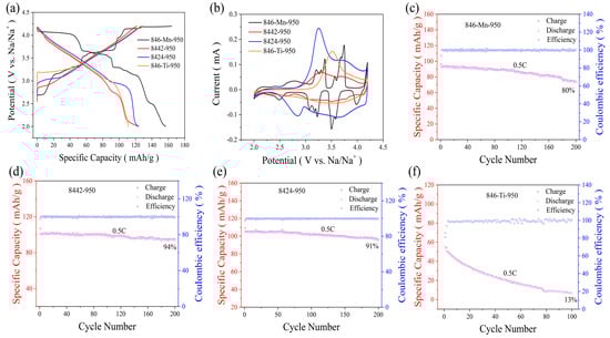 (a) charge-discharge curves of Na0.8Ni0.4Mn0.6-xTixO2-950 electrodes at 0.1 C between 2.0 and 4.2 V. (b) cyclic voltammetry (CV) profiles of Na0.8Ni0.4Mn0.6-xTixO2-950 electrodes scanned at a rate of 0.1 mV/s. (c–f) cycling performance of Na0.8Ni0.4Mn0.6-xTixO2-950 electrodes at 0.5 C rate.