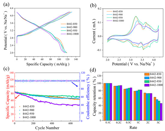 The above-mentioned XRD results indicate the phase ratio of the P2/O3 composite can be adjusted by altering the synthesis temperature. To study the influence of synthesis temperature on cycling stability and rate performance of Na0.8Ni0.4Mn0.4Ti0.2O2, we performed galvanostatic charge/discharge and cyclic voltammetry measurements using half-cells. It can be found from Figure 4a,b that O3-rich 8442-850, 8442-900, and 8442-950 cathodes show similar charge-discharge profiles and cyclic voltammetry curves, which are different compared with those of the single-phase O3-type 8442-1000 cathode. Due to the synergistic effect of P2/O3 phases, O3-rich 8442-850, 8442-900, and 8442-950 cathodes exhibit much better cycling stability and higher specific capacities than O3-type 8442-1000 (Figure 4c). It should be pointed out that 8442-950, with the highest O3-phase ratio (20.8 wt% P2 phase, 74.9 wt% O3 phase), has the best cycling performance with a capacity retention of 84% (700 cycles, 3 C), which is also better than those of previously reported P2/O3 composite materials (Table S11). The rate capabilities of Na0.8Ni0.4Mn0.4Ti0.2O2-950 cathodes at rates of 0.1 C, 0.2 C, 0.5 C, 1 C, 2 C, and 5 C were also examined and displayed in Figure S3a–d. To conveniently compare the rate retention, the capacities at different rates were normalized with reference to the values obtained at 0.1 C (Figure 4d). It can be found that Na0.8Ni0.4Mn0.4Ti0.2O2-850 cathodes show better rate performance than other cathodes at high rates. These results demonstrate O3-rich Na0.8Ni0.4Mn0.4Ti0.2O2-950 and Na0.8Ni0.4Mn0.4Ti0.2O2-850 materials are promising cathodes for SIBs with a long operation life and fast-charge performance, respectively.