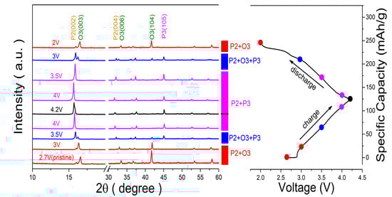 Ex-situ XRD patterns of 8442-950 electrode charged and discharged at different voltages.
