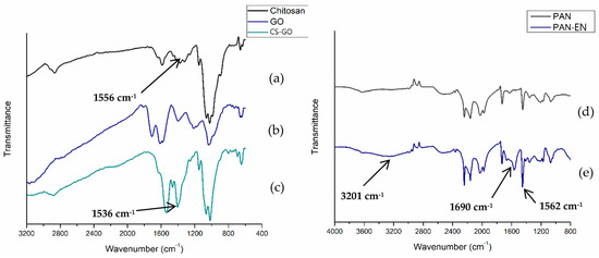 FT−IR spectra of (a) CS, (b) GO, (c) CS-GO membrane, (d) PAN and (e) PAN-EN electrospun nanofibers.