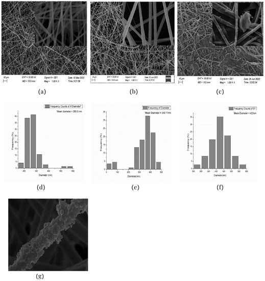 SEM images of (a) PAN membrane (b) PAN–EN membrane and (c) CS–GO-electrosprayed PAN–EN membrane; histograms of (d) PAN membrane and (e) PAN–EN membrane (f) CS–GO-electrosprayed PAN–EN membrane; SEM images of (g) magnified nanofiber of CS–GO-electrospun PAN–EN membrane.