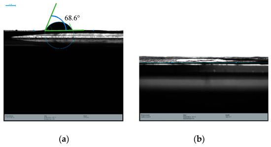 Owing to its excellent chemical, mechanical, and thermal characteristics, PAN is a polymer that is frequently employed to produce EPNFs; however, due to its poor surface wettability, dye absorption is hindered. Surface modification has been suggested in the literature as a method for enhancing the hydrophilicity of polymeric nanofibers. Surface coating and wet chemistry are two post-treatment methods used in the current study for the manufactured PAN EPNF. While the former refers to the surface coating of the functionalized PAN membrane by electrospraying, the latter relates to the modification of PAN with EN by the chemical interaction of the amino-functional units in EN with the nitrile groups in PAN. As illustrated in Figure 6a, a static contact angle of 68.6° was measured from the PAN EPNF using the sessile drop method. Following the surface alterations, the fabricated EPNF showed perfect wettability, as shown in Figure 6b, but the static contact angle of the sample could not be measured because the water droplet was instantly absorbed into the sample. According to previous studies, an EPNF’s hydrophilicity relies on its homogeneity, polarity, and layered thickness [22]. An effective coating of the top tier is responsible for a noticeable rise in the surface wettability of the CS–GO-electrosprayed PAN–EN-electrospun nanofiber membranes. The study’s observations are coherent with the results described by Lou et al. [40]. It is possible that the polarity that GO imparted had a role in the increase in hydrophilicity. Thus, with the use of analytical reasoning, it could be inferred that the dye adsorption capacity might be enhanced by the improved surface wettability of the membrane.