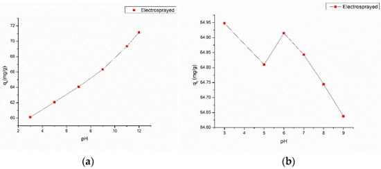 To investigate the impact of pH on the adsorptive capacity of a CS–GO-electrosprayed PAN–EN-electrospun membrane for MB, a starting concentration of 5 ppm MB was arranged, and the pH of the solution was ranged to be from 3 to 10 via incremental additions of 0.1M HCl/0.1 M NaOH solutions. This was carried out because the ionization of GO is affected by the pH of the solution due to the presence of carboxylate functional groups on GO, which experience partial separation in water-based solutions to generate hydrogen and carboxylate ions. By introducing hydroxide (OH−) ions, the equilibrium would shift towards the ionization of carboxylate groups, according to Le Chatelier’s principle.