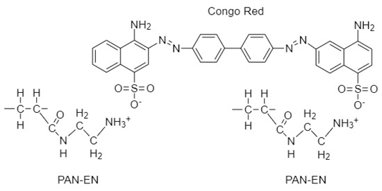 Polyacrylonitrile (PAN) is an extensively used polymer in manufacturing EPNFs, owing to its low density, and chemical and thermal stability [22]. Electrospun PAN nanofibers’ insufficient adsorption sites or lack of surface wettability limit their ability to remove dye pollutants from wastewater [22]. It has been suggested in the literature, that surface modification is the best method to overcome the limits in PAN’s ability to remove organic pollutants since it could impart functional groups to the PAN structure [23,24,25]. According to early research studies, introducing functional groups that include oxygen or nitrogen could considerably increase the adsorbing capacity of polymeric adsorbents. Amino functionalization is generally preferred due to its ability to form potent complexes with organic pollutants [23,26,27]. Conforming to the literature, Almasian et al. [23] were the first to create amino-functionalized electrospun PAN nanofibers to enable anionic dye removal. It has been shown that surface functionalization is essential for improving PAN EPNFs’ ability to adsorb materials. Mahmoodi et al. [28] developed a porous modified PAN nanofiber membrane by incorporating sodium carbonate, which also possesses a greater anionic dye adsorption capability. According to a study by Patel and Hota [29], the density of amino groups directly correlates with the adsorptive capacity of functionalized PAN EPNFs, which is modified using ethylenediamine (EN), demonstrating the greatest adsorption capacity for CR dye, which was reported to be 130 mg/g [29].