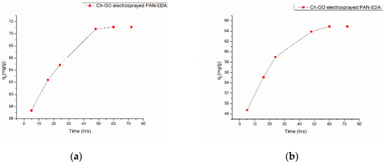 An adsorbent and a dye require an adequate contacting duration to achieve equilibrium. According to the data displayed in the graphs in Figure 10a,b, a period of 48 h was needed to attain equilibrium. Additionally, by changing the temperature, the relationship between temperature and the adsorption capacity for the dyes MB and CR on the chitosan-graphene oxide-electrosprayed PAN-EN membrane was examined. However, there was no remarkable alteration in the concentration in which equilibrium was noticed.