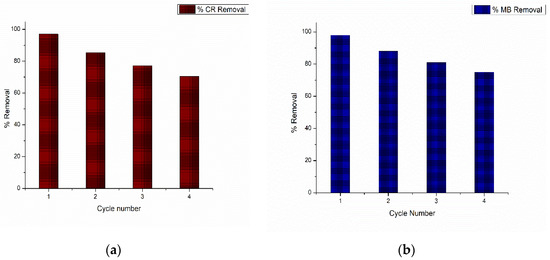 To evaluate the adsorbent’s regeneration capacity, a 0.01 M NaOH solution was used to treat the dye-adsorbed CS–GO-electrosprayed PAN–EN membrane. The dye adsorbed on the nanocomposite was removed by stirring the NaOH treated membrane constantly at 150 rpm for 2 h. The adsorbent was washed in multiple instances with deionized water and dried in an oven to dry the membrane for 1 h at 60 °C. The nanocomposite membrane was subsequently reused to remove dyes in the next cycle. A reusability study was conducted to investigate the nanocomposite membrane’s regeneration capability of removing MB and CR dyes, with the regeneration capacity of the CS–GO electrosprayed PAN–EN membrane being studied over four consecutive cycles.