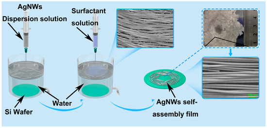 AgNW-based films were prepared with commercial nanowires from Zhejiang Kechuang Advanced Materials Technology Co., Ltd in Hangzhou, China, (diameter 45 nm ± 10 nm, length 10–100 μm) (Supplementary Materials, Figure S1). They are synthesized using a polyvinylpyrrolidone (PVP)-mediated method. After ultrasonic and centrifugal cleaning of the nanowires with pure water, we dispersed the silver nanowires in a solution by adding a certain mass of ethanol and n-Hexane. Then, the dispersion, which contains AgNWs, was injected at a speed of 0.25 mL/min using a syringe onto a round water surface with a diameter of 100 mm. The self-assembly AgNWs were completed during the evaporation of the non-polar solution. After the water was drained, the Ag NWs films were deposited on hydrophilic silicon wafers freshly treated with plasma treatment. The schematic diagram is shown in Figure 1.