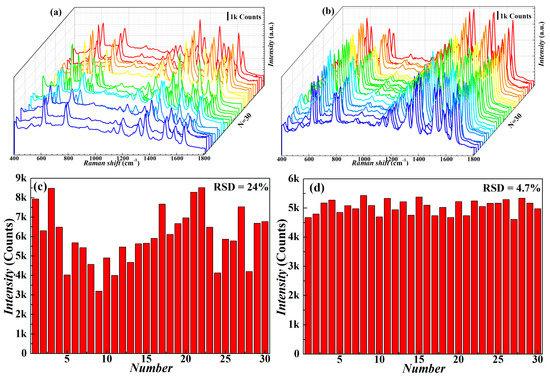 Repeatability and stability of 1.0 × 10−10 M R6G on SERS substrates: (a,b) the Raman spectrum of 30 points randomly selected on AgNWs’ SERS substrate of 2 mg/mL and 1 mg/mL, respectively; (c,d) Raman intensity distribution at the characteristic peak at 1364 cm−1 corresponding to the 30 spectra in (a,b).