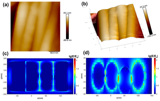 SERS enhancement mechanism of AgNWs substrate: (a,b) AFM scanned microzone images of AgNW array; (c,d) normalized logarithmic distribution of electric field intensity based on microzone structure simulated by FDTD, showing the XY cross-section and XZ cross-section.