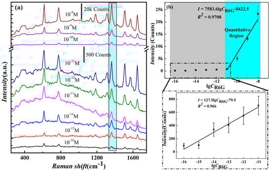 The intensity of the characteristic spectra of 1364 cm−1 in the range of 1.0 × 10−8 M–1.0 × 10−16 M is shown in Figure 5b. In the 1.0 × 10−8 M–1.0 × 10−16 M range, although the peak intensity values always increase with an increasing concentration, the intensity values can be divided into two segments for linear detection, depending on the magnitude of their changes. The characteristic peak Raman intensity is linearly well-related to the logarithm of R6G concentrations in the 1.0 × 10−8 M–1.0 × 10−11 M range (as shown in Figure 5b in the cyan area), and the linear relationship is as follows: I = 7583.6lgCR6G-8422.5, where I is the SERS intensity at the 1364 cm−1 characteristic peak, linear correlation coefficient R2= 0.9708. Meanwhile, in the 1.0 × 10−11 M–1.0 × 10−16 M range (a grey area), the intensity shows little change and shows another linear relationship related to the logarithm of R6G concentrations. This indicates that only a few of the R6G molecules adsorbed in nanogaps between AgNWs provide a weaker Raman signal, likely due to the monolayer adsorption mode in the low concentration range [37]. This shows the relationship I = 127.5lgCR6G-79.5, where I is the SERS intensity at the 1364 cm−1 characteristic peak, linear correlation coefficient R2 = 0.966.
