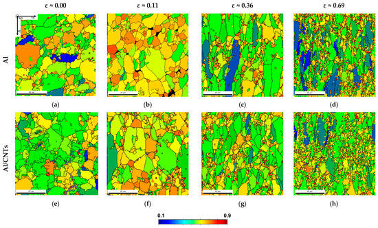 Grain shape aspect ratio maps of (a–d) Al and (e–h) Al/CNTs samples, cold rolled to strains of 0.00, 0.11, 0.36, and 0.69.