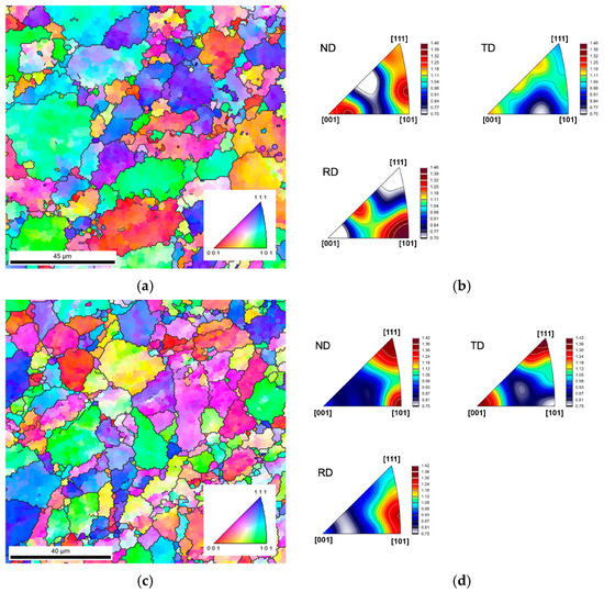 (a,c) IPF maps and (b,d) IPF of the sintered Al (above) and Al/CNTs (below) samples.