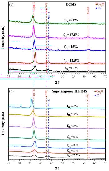 X-ray diffraction spectra of Cu2O films deposited by (a) DCMS and (b) superimposed HiPIMS at different oxygen flow rates.