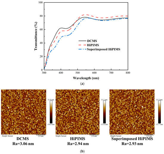 We determined the UV-Vis transmittance of these Cu2O-deposited ITO samples using air as a background (Figure 2a). The transmittance of the HiPIMS sample was slightly more than 80%, while in contrast, that of the DCMS and superimposed HiPIMS samples were each a bit less than 80% (<3%), in a wavelength range (500-900 nm). Due to the high ionization rate and high-energy plasma of the HiPIMS process, it offers dense and highly crystalline Cu2O films. Therefore, we observed higher transmittance of respective Cu2O in comparison with the DCMS sample (i.e., the structure was less dense). Although the superimposed HiPIMS process has the same advantages as the HiPIMS process, the MF power applied during the off-time bombarded more copper that became deposited as film, possibly contributing to the decrease in transmittance.