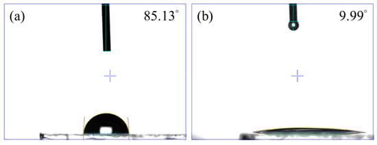 Figure 3 shows the contact angles of the ITO/Cu2O surfaces when we dropped the perovskite precursor solution on top. As indicated in Figure 3a, the perovskite precursor formed a sphere on the HiPIMS Cu2O samples (i.e., a high angle of 85.13°), spreading poorly on the Cu2O surface and causing failure growth of the perovskite layer. The DCMS and superimposed HiPIMS Cu2O samples also had high angles, of 89.95° and 69.31°, respectively, as shown in Figure S1, which also led to poor spread of the perovskite precursor. To resolve this issue, we applied a plasma treatment to induce an ultraviolet effect that modified the surface of the Cu2O films. As indicated in Figure 3b, the Cu2O film became hydrophilic with a low angle of 9.99°, leading to the preferred growth of the perovskite layer.