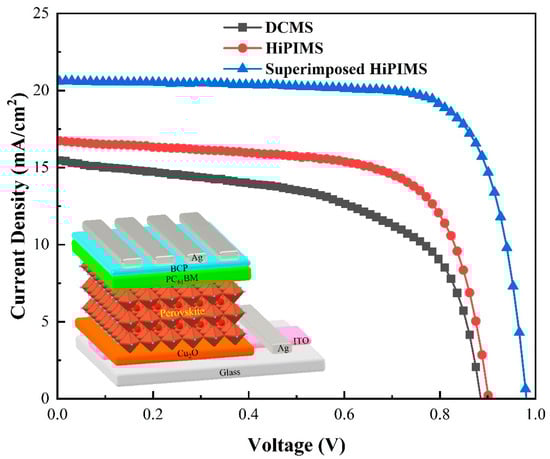 Cu2O films (10 nm) were deposited by DCMS, HiPIMS [], and superimposed HiPIMS [] techniques, subsequently, on an ITO substrate. Before spin-coating the perovskite precursor solution, we used plasma to modify the Cu2O surface for 30 s and coat the precursor solution smoothly. Details of the device fabrication and characterization of the materials are shown in the Supplementary Materials.