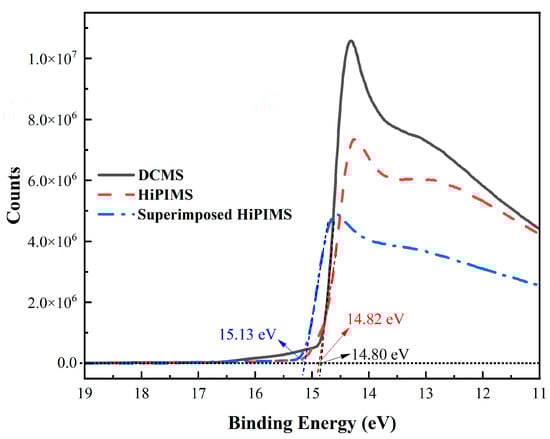 UPS spectra of ITO/Cu2O films (DCMS, HiPIMS, and superimposed HiPIMS).