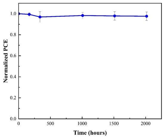 We examined the shelf lives of the unencapsulated devices under an argon glove box in the dark to assess the stability of the superimposed HiPIMS Cu2O sample for PSC applications (we measured the PCE results at least three times to calculate the error bars). The devices initially offered the best PCE of 15.20%, as shown in Figure 6. After testing for 168 h, the devices retained 99.4% of their initial performance; after testing over 1000 h, the devices retained 98.3% of their initial performance; and after testing over 2000 h, the devices retained 97.6% of their initial performance. Thus, our PSC device suggested high stability. Finally, we determined the performance of the superimposed HiPIMS device under dim light (a TL-84 fluorescent lamp with an illumination of 1000 lux). Table 3 shows the performance of the respective device. The device showed a PCE of 25.09%. Based on these results, we demonstrated that Cu2O film has great potential as HTLs of PSCs under one sun and indoor illumination.