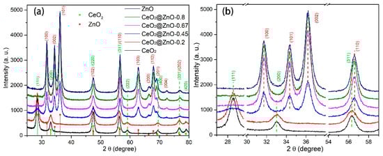 (a) XRD patterns for the CeO2, ZnO, and CeO2@ZnO nanocomposites (predicted peak positions for cubic CeO2 and hexagonal ZnO are shown on the x-axis) and (b) an enlarged figure showing the most intense diffraction peaks in (a).