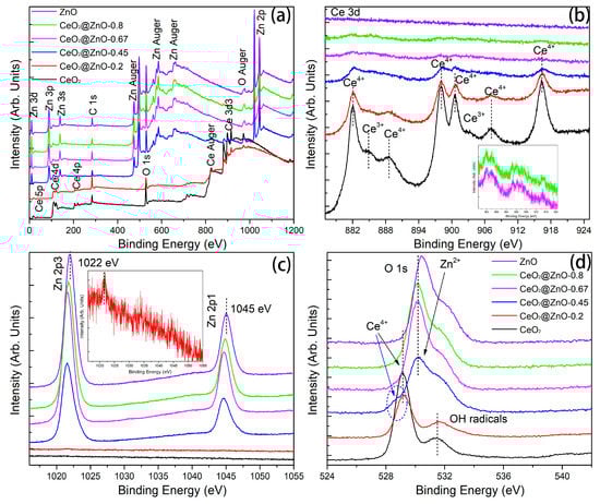 XPS spectra of the CeO2, ZnO, and CeO2@ZnO nanocomposites: (a) survey spectra and high-resolution (b) Ce 3d, (c) Zn 2p, and (d) O 1s spectra.