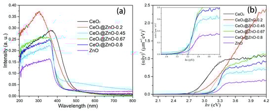 The optical properties of the CeO2, ZnO, and CeO2@ZnO nanocomposites were investigated using UV-vis absorption spectroscopy, and the results are shown in Figure 6a. With an increase in the Zn:Ce ratio, the optical absorption edge shows a progressive blue shift. The optical band gaps of the CeO2, ZnO, and CeO2@ZnO nanocomposites were obtained using the Tauc formula [39]: αhν = A(hν − Eg)2, where α, h, ν, A, and Eg are the absorption coefficient, Planck’s constant, the frequency of the incident light, a constant, and the optical band gap, respectively. The fitting curves for (αhν)2 vs. hν are shown in Figure 6b. The linear part of the curve is extrapolated, and the x intersection is the optical band gap. Thus, the optical band gaps of the CeO2, CeO2@ZnO-0.2, CeO2@ZnO-0.45, CeO2@ZnO-0.67, CeO2@ZnO-0.8, and ZnO nanomaterials are 2.789, 3.06, 3.164, 3.195, 3.20, and 3.214 eV, respectively, showing an increasing trend with an increase in the Zn:Ce ratio. As the Zn:Ce ratio is increased, a transformation from CeO2 to CeO2@ZnO to ZnO occurs, and the size of the composite decreases from 800 nm to 10 nm. The quantum effects arising from particle size limitations cause a blue-shift in the absorption edge and an increase in the band gap. Crucially, the band gap determines the range of light that can be absorbed and, thus, used during photocatalytic degradation.