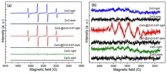 EPR spectra of the CeO2, ZnO, and CeO2@ZnO nanocomposites in the dark and under light irradiation: (a) DMPO-OH and (b) DMPO-O2−.