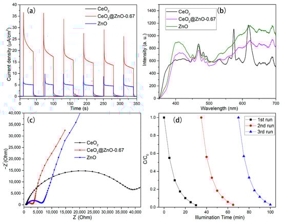 To investigate the separation ability of the photogenerated electrons and holes, the transient photocurrent characteristics of the CeO, ZnO, and CeO2@ZnO-0.67 nanocomposites were measured. As shown in Figure 9a, the CeO2@ZnO-0.67 nanocomposite produces a stronger photocurrent than CeO2 and ZnO, indicating that has the highest number of photogenerated charge carriers under illumination. In addition, the PL spectra of the CeO2, ZnO, and CeO2@ZnO-0.67 were measured. As shown in Figure 9b, the intensity of the luminescent peak for CeO2@ZnO-0.67 is significantly lower than that of CeO2 and ZnO, which indicates that the electron–hole pairs generated by CeO2@ZnO-0.67 have a low recombination rate. The efficiency of the direct electron transfer and separation of photogenerated electrons was evaluated using EIS (Figure 9c). In the EIS spectra, the arc radius determines the resistance of the interface layer, which affects the separation of electrons. A small arc radius means that electrons can be transported quickly. Among the three photocatalysts, CeO2@ZnO-0.67 exhibits the smallest arc radius, indicating its excellent charge transfer ability. Cycling experiments were performed to evaluate the stability and recyclability of CeO2@ZnO-0.67. Figure 9d shows that the high photodegradation efficiency of CeO2@ZnO-0.67 is maintained after three cycles.