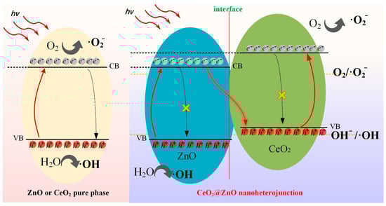 Based on the previously described analysis, the separation mechanism of the photogenerated electron–hole pairs is shown in Figure 10. Generally, the photoexcited electrons easily recombine with the holes in the VB. In CeO2 or ZnO pure phase materials, the recombination of excited electrons in CB and holes in VB is dominant, which considerably reduces the efficiency of photodegradation. Therefore, the inhibition of charge carrier recombination is crucial for enhancing photocatalytic efficiency. Unlike CeO2 and ZnO, the CeO2@ZnO nanocomposite contains a heterojunction interface, which prevents the recombination of photogenerated charge carriers and ensures the production of free radicals for Z-scheme catalytic photodegradation. In detail, the excited electrons in ZnO preferentially recombine with the holes in CeO2, which enables the electrons in the CB of CeO2 and the holes in the VB of ZnO to interact fully with oxygen and water to generate free radicals for dye decomposition.