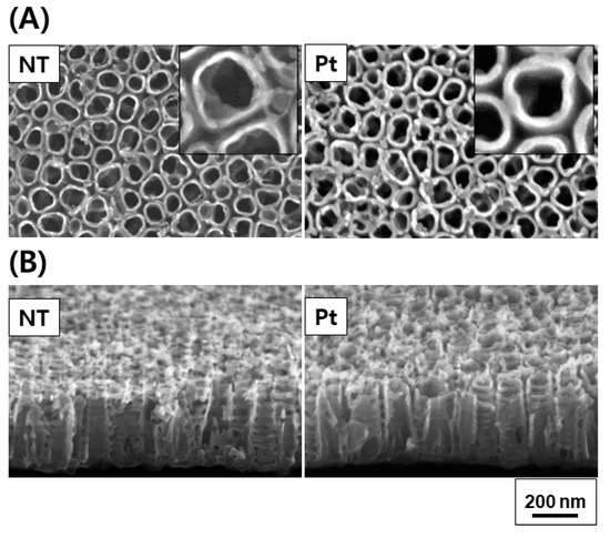 FE-SEM plain (A) and oblique views (B) of TiO2 NT and Pt-TiO2 NT (inset: magnified plain view).